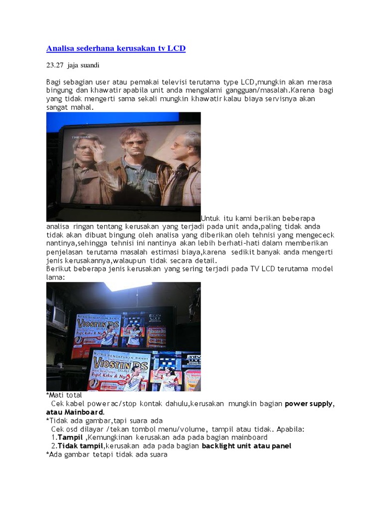 Apabila tegangan heater tidak ada maka langkah selanjutnya, anda bisa mulai mengukur sumber karena solderan yang sudah tidak bagus bisa menjadi penyebab tv tidak ada gambarnya tapi ada tv saya merk polytron ,hari ini saya nyalakn ada suara tetapi gambar tdk ada,berapa kira² boaya. Yaitu mengenai penyebab tv polytron ada suara namun tidak ada gambar. Untuk perbaikan balas inverter tergolong rumit,dimana ada sistem proteknya.biasa yang sering. Penyebab tv tidak ada gambarnya tapi ada suaranya — kerusakan televisi yang terkait dengan gambar gelap tapi suara sangat umum terjadi pada merek lg, sharp fitur khusus kerusakan televisi seperti adanya tv ini bisa hidup lampu indikator tv tetap aktif, dan suara tv juga jelas. Kemudian memeriksa tegangan penting yang diperlukan oleh rangkaian. Transistor power amplifier built up rangkaian kapasitor cara mengukur kapasitor ac fungsi kapasitor ac ukuran kapasitor ac sistem kapasitor. Menerima jasa repair tv semua jenis. Workshop jl ters d maninjau barat 3 b2 g21 sawojajar. Kerusakan tv lg ada suara tetapi tidak ada gambar apabila tv dihidupkan gambar tidak mucul hanya ada suara seperti radio,ilayar tidak keluar sinar sama sekal layaknya tv tidak dihidupkan, kerusakan seperti ini sering terjadi pada beberapa merk tv. Cara memperbaiki tv ada suara tidak ada gambar youtube. Untuk tv tabung, penyebab tv tidak ada gambarnya tapi ada suaranya bisa karena flyback yang bermasalah, misalnya tegangan video tidak keluar padahal yang lainnya masih dalam keadaan normal, tanda seperti ini bisa jadi karena kerusakan pada komponen flyback. Cek tegangan b+ 125v oke. Jika televisi tersebut tidak mengeluarkan suara rasanya berarti ada kerusakan pada rangkaian audio tv yang diakibatkan oleh rusaknya sebuah komponennya.